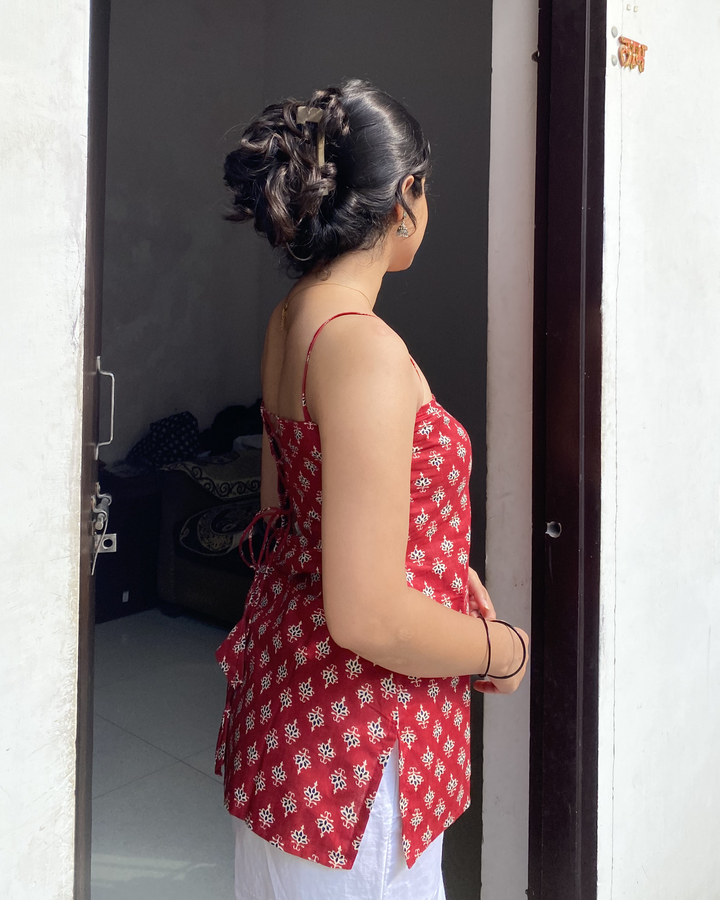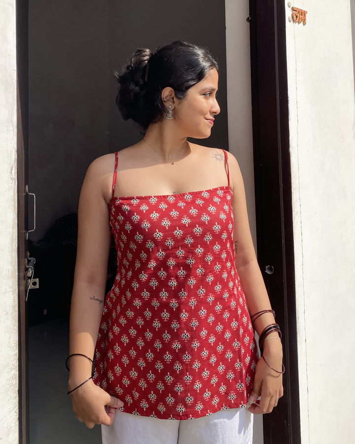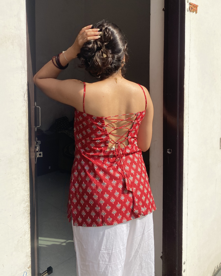Navya Red Cotton Printed Noodle Strap Top With Corset Back