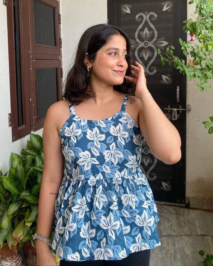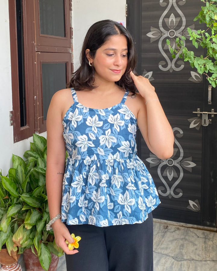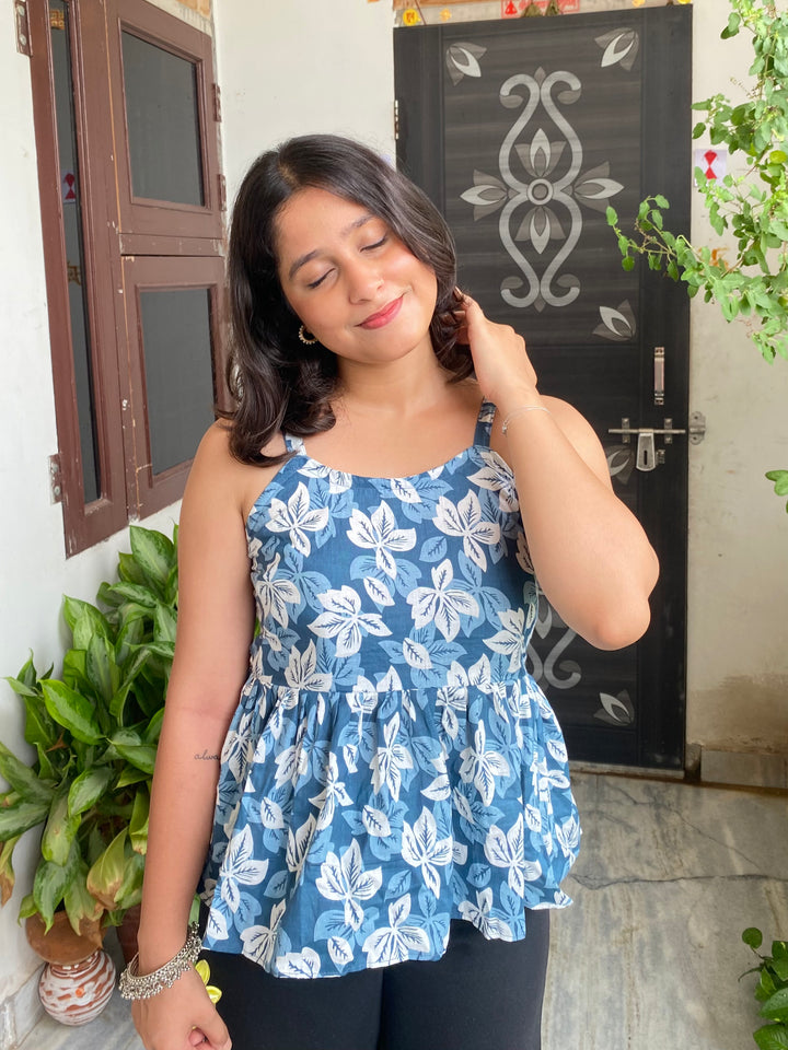 Riyana Blue Cotton Printed Strap Shoulder Top With Butterfly Back