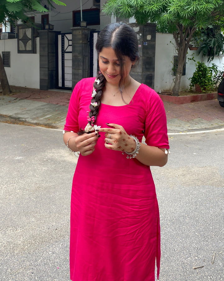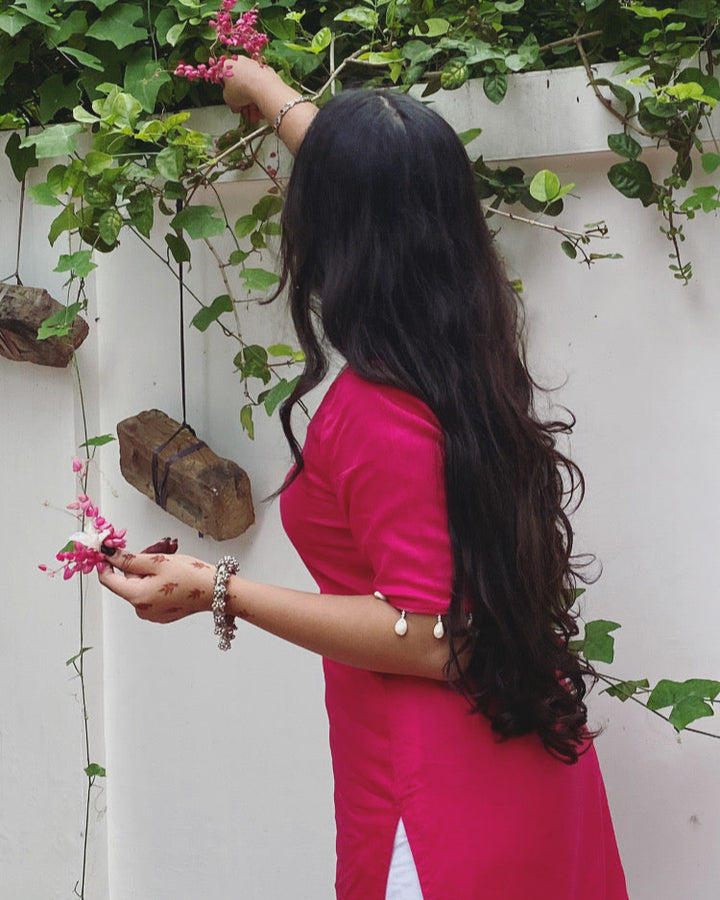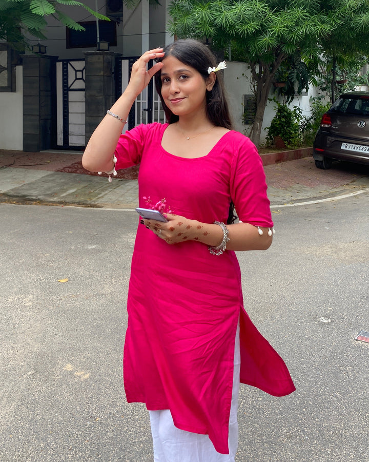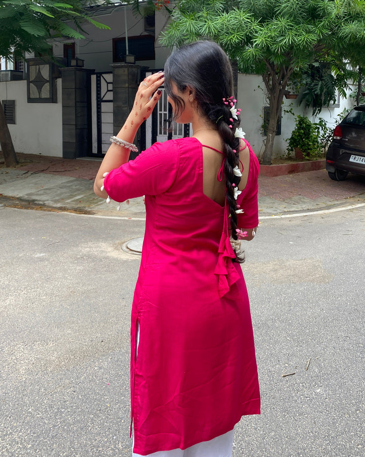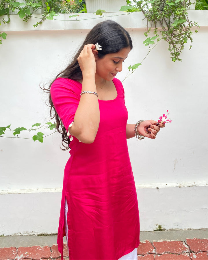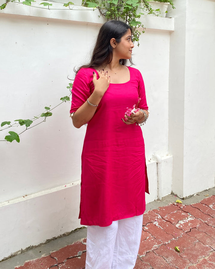 The Shayra Pink Plain Rayon Kurti With Beads On Sleeves is a graceful blend of simplicity and subtle detailing. Made from soft, flowy rayon fabric, it drapes beautifully and ensures all-day comfort. The plain pink design adds a touch of understated elegance, while the delicate beadwork on the sleeves enhances its charm with just the right amount of sparkle.